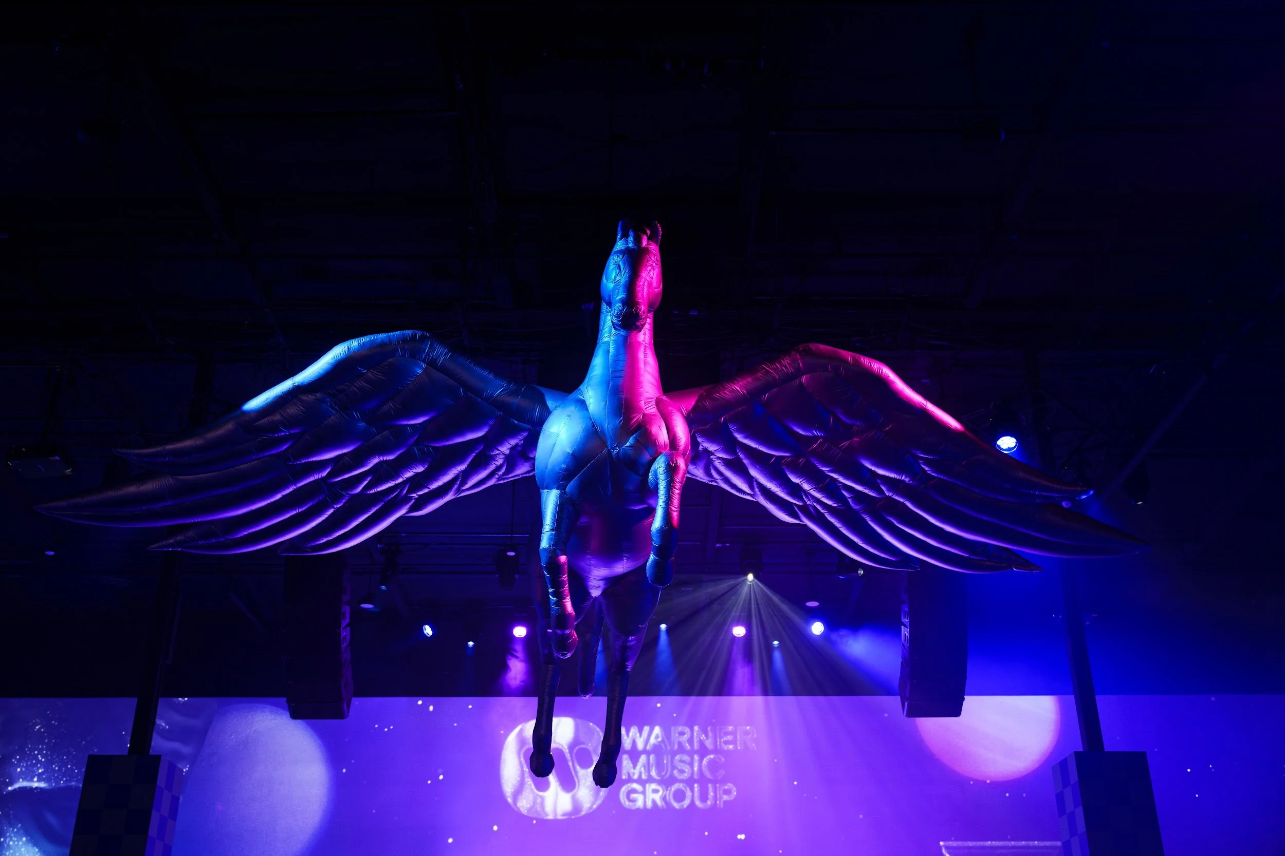 Inside, our versatile venue was reimagined as a futuristic disco dreamscape. The space was bathed in a navy blue and silver palette, with projections of space-age patterns and mythic architecture dancing across the walls. In a striking symbol of artistic ascent and reinvention, a massive silver Pegasus was suspended over the dance floor in place of a traditional mirror ball.
